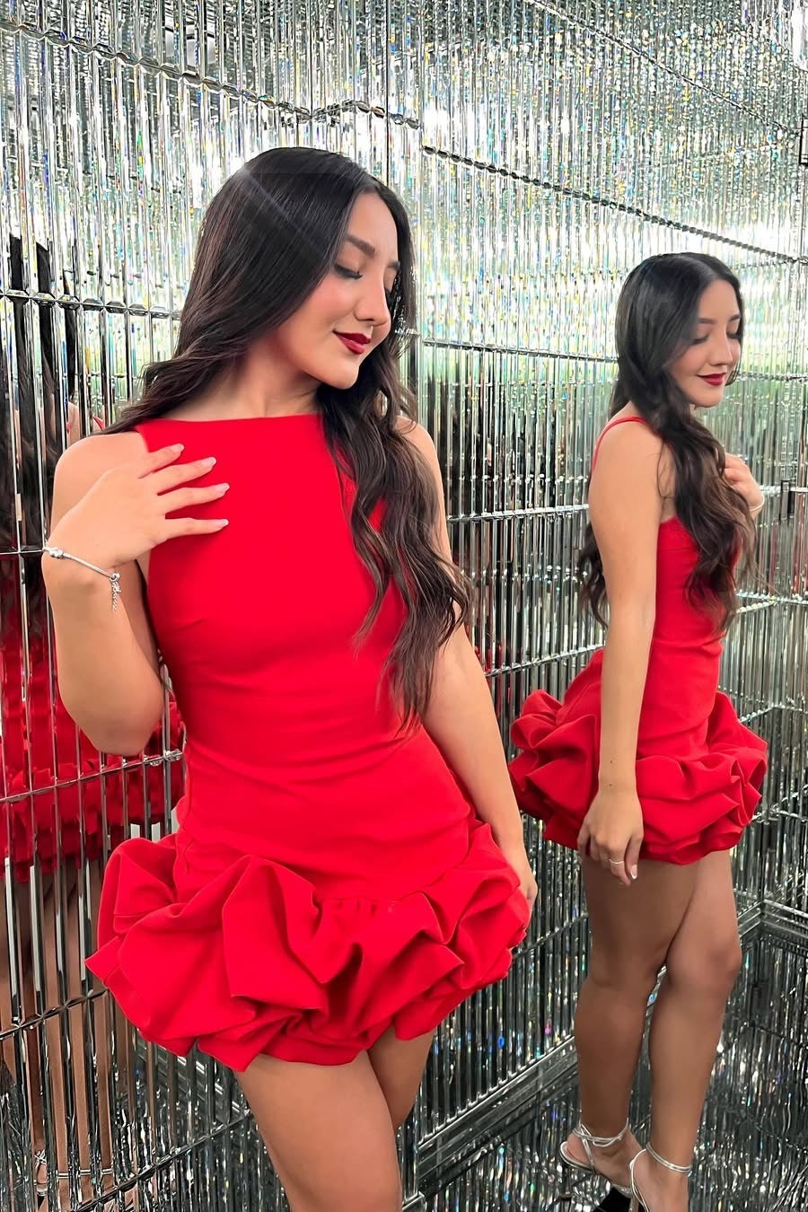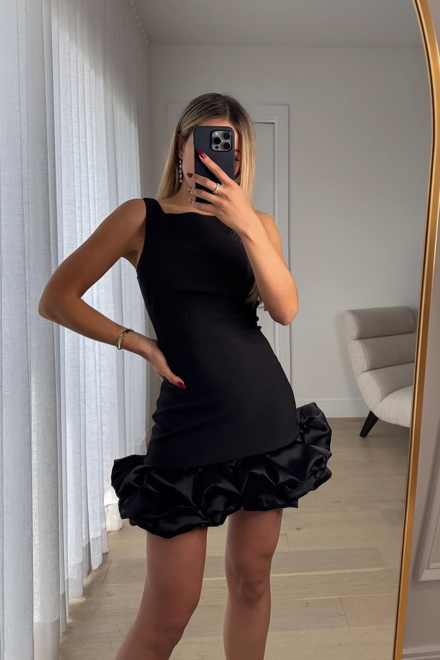 The dress is adorned with a playful ruffled hem, adding a touch of femininity and flair to the overall aesthetic. Perfect for both daytime events and evening soirées, this versatile piece is a wardrobe essential.